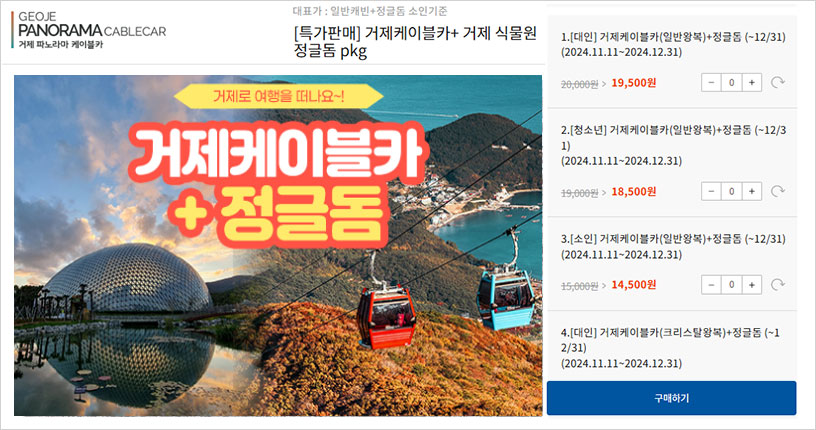 거제 케이블카와 식물원인 정글돔 입장료를 묶어서 할인가로 판매하고 있습니다. 식물원 구경이 같이하는 일석이조를 원하시면 이 패키지를 구매하시면 됩니다.
