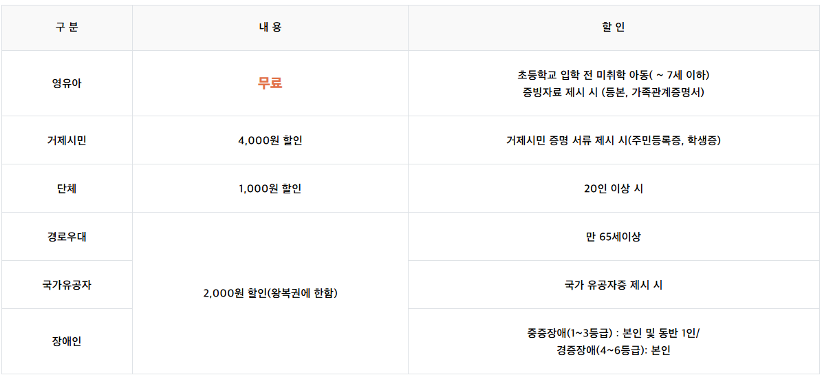 - 거제시민은 거제 거주지 주소가 명시되어 있는 증빙서류를 제시하셔야 할인이 가능합니다.