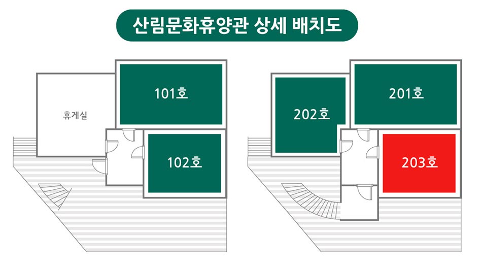 - 6인실, 33㎡ : 산림휴양관201, 산림휴양관202,산림휴양관203