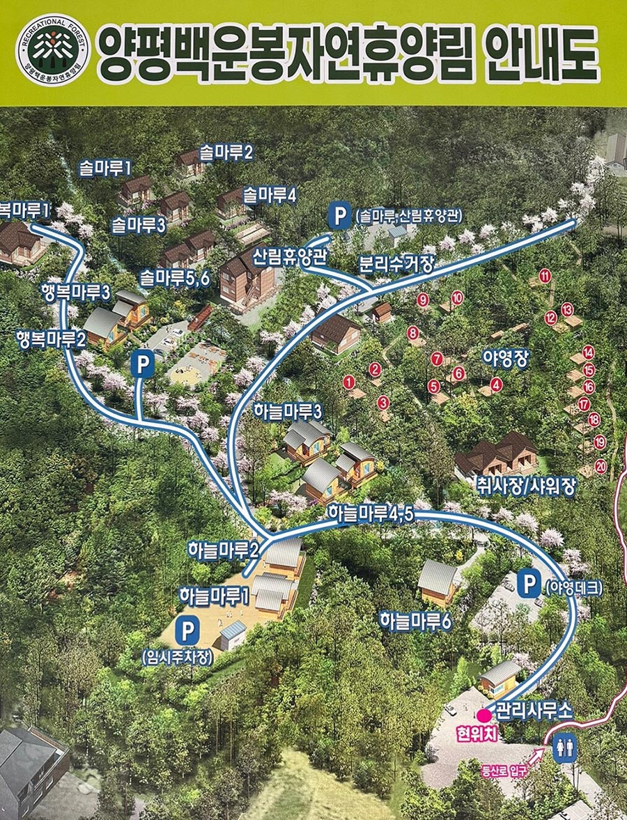 - 주소 : 경기 양평군 양평읍 약수사길 78-14 양평 백운봉 자연휴양림