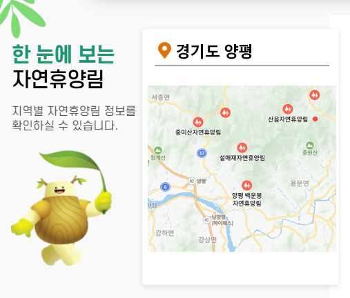 경기도 양평 지역의 자연휴양림을 모아놓았습니다. 아래 사진으로 위치확인 후 버튼을 클릭하시면 각각의 자연휴양림 예약 페이지로 이동됩니다.