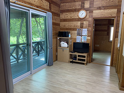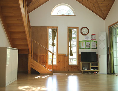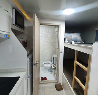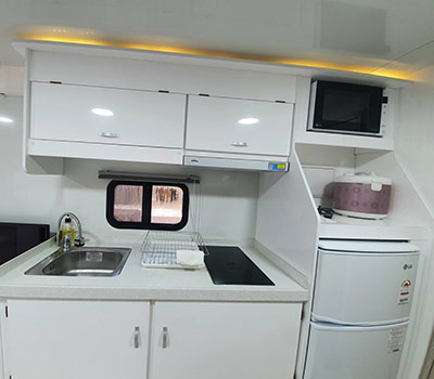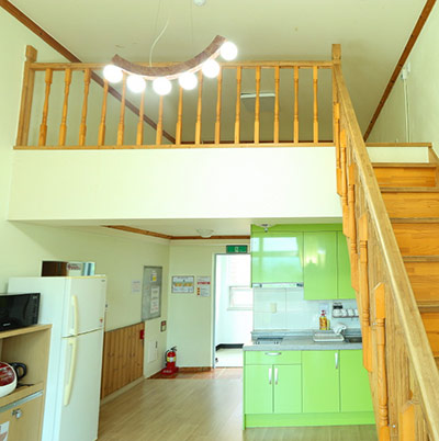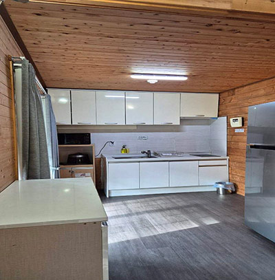 - 거실: 2인용 침대, 2층 침대, 수납공간, 식탁, 고정의자, 텔레비전(32인치), 화재센서 및 연기감지기, 에어컨, 온풍기