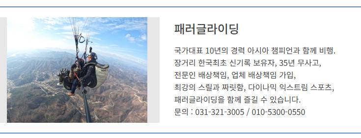 국가대표 10년의 경력 아시아 챔피언과 함께 비행. 장거리 한국최초 신기록 보유자, 35년 무사고,전문인 배상책임, 업체 배상책임 가입, 최강의 스릴과 짜릿함, 다이나믹 익스트림 스포츠,패러글라이딩을 함께 즐길 수 있습니다