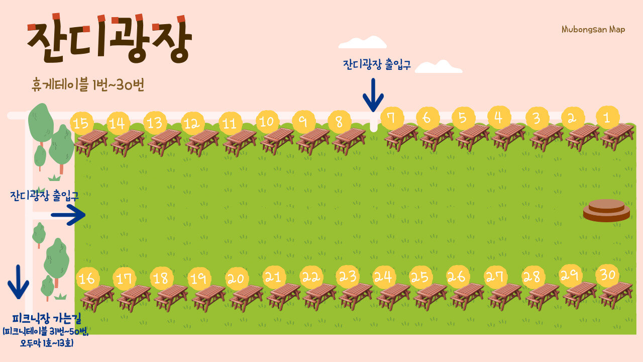 휴게테이블은 잔디광장에 위치하여 있으며, 그늘막텐트 설치 가능합니다. 참고하세요!