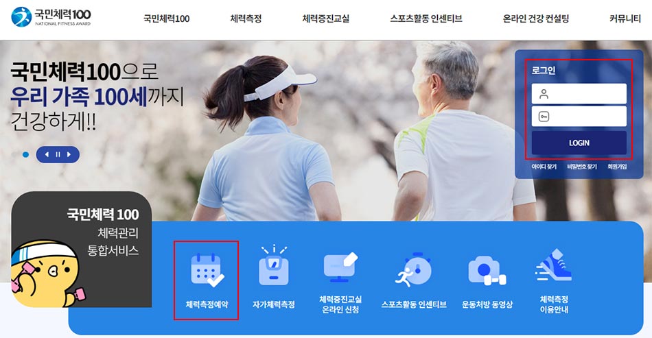 1. 온라인 예약: 국민체력100 홈페이지 (https://nfa.kspo.or.kr) 에서 회원가입 후 온라인으로 체력측정 신청