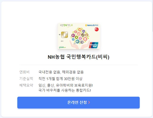 국민행복카드는 첫만남이용권을 포함한 여러 정부 지원 서비스를 이용할 수 있는 카드입니다. 다음의 카드사에서 발급받을 수 있습니다. 카드사별 주요혜택을 소개해 드리겠습니다.