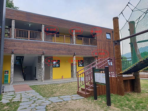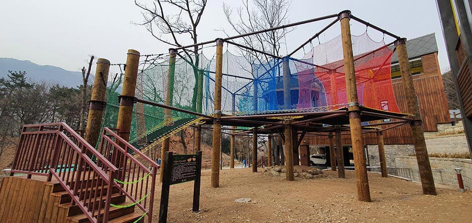 휴양림 내 휴양관 앞에 설치된 놀이시설(트램폴린)로 어린이 전용 놀이시설 입니다. 24년 11월 3일 부터 25일 3월 26일까지는 운영이 중단됩니다. 참고하세요!