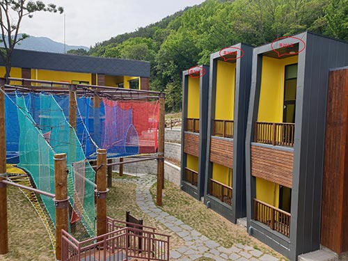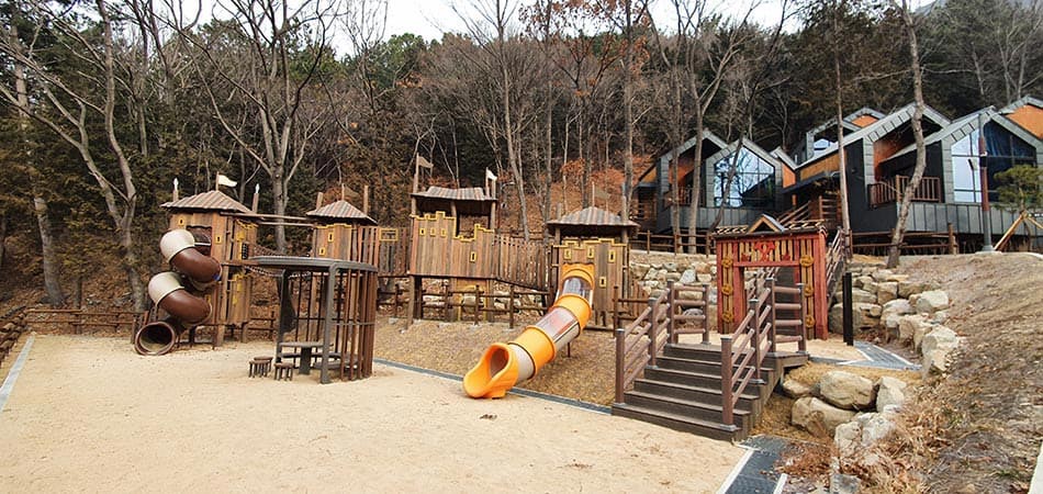 휴양림 내 숲속의 집 옆에 설치된 종합놀이기구로 어린이 전용 놀이시설 입니다.