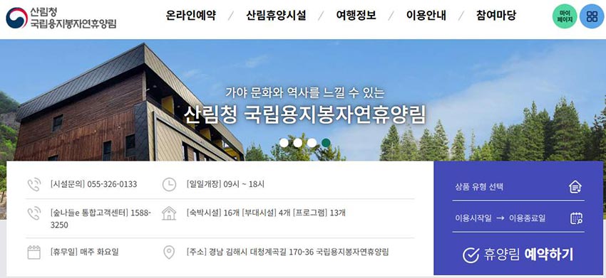- 주소 : 경남 김해시 대청계곡길 170-36 국립용지봉자연휴양림