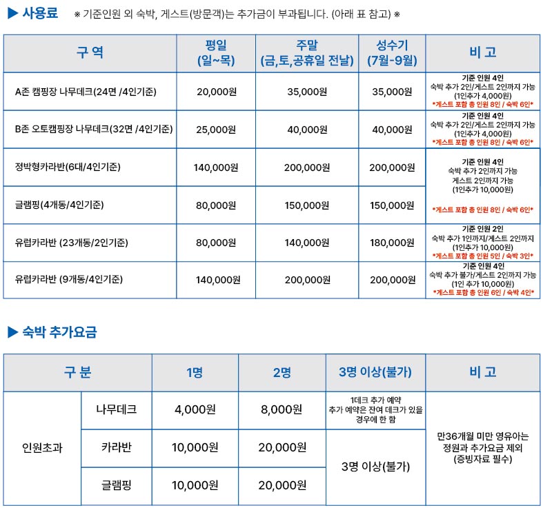 - 오토캠핑 데크, 캠핑데크, 카라반, 글램핑 인원 초과시 추가 요금이 부과 됩니다.