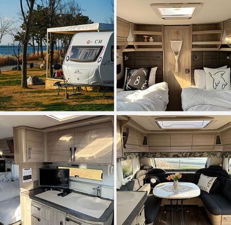 숙박으로는 오토캠핑 데크, 유럽 카라반 2-3인, 4-5인, 정박형 카라반, 글램핑 중에서 선택하실 수 있습니다.