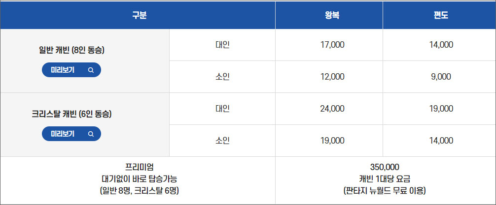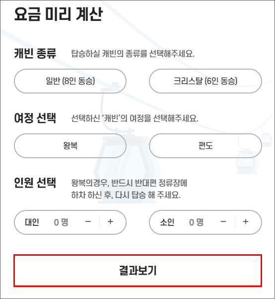 케이블카 탑승시 미리 요금을 계산할 수 있습니다. 일반 캐빈인지, 아래가 투명한 유리로 되어 있는 크리스탈 캐빈인지 선택을 하고, 왕복구간 또는 편도 구간을 확인합니다. 인원을 선택하고 결과보기를 클릭하시면 탑승 비용을 미리 확인할 수 있습니다.