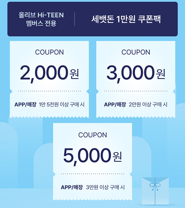 올리브 Hi-TEEN 멤버스 전용으로 세뱃돈 1만원 쿠폰팩을 제공합니다.