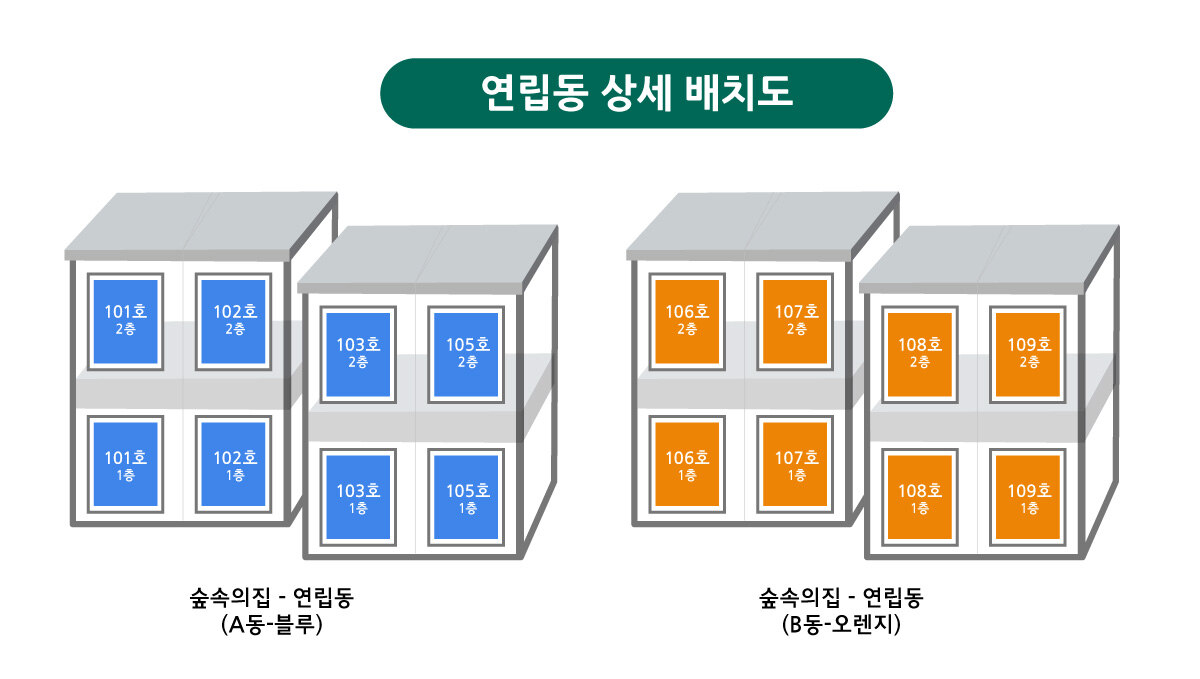 숙박시설로 선택할 수 있는 유형으로 숲속의집(00도), 연립동A,B이 있습니다. 가족인원과 평형을 잘 보시고 정확한 숙소는 아래 버튼으로 이동하여 사진으로 확인하세요!