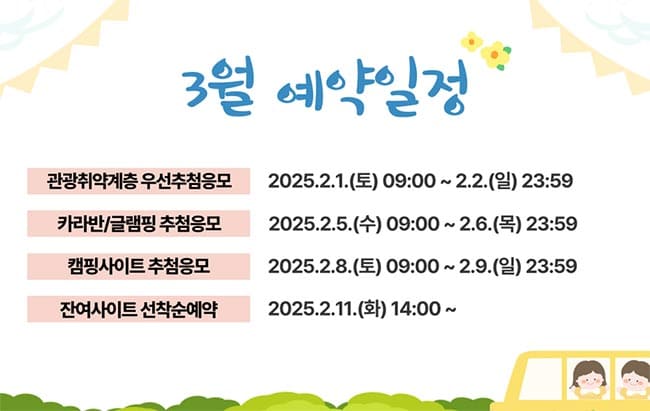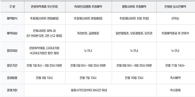 - 관광취약계층 우선추첨은 관광취약계층(다자녀가정 포함)만 응모 가능하며, 입실 시 현장에서 증빙하지 못하는 경우 예약취소 및 6개월간 캠핑장 이용이 제한되오니 유의해주시기 바랍니다.