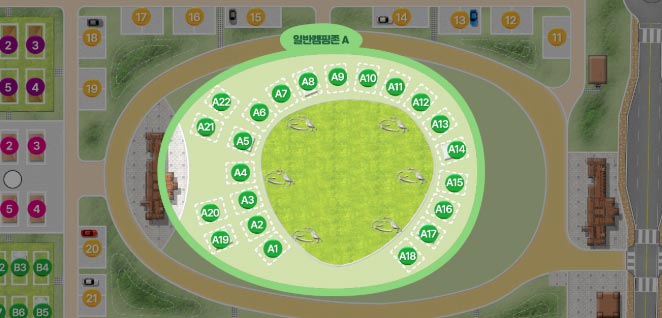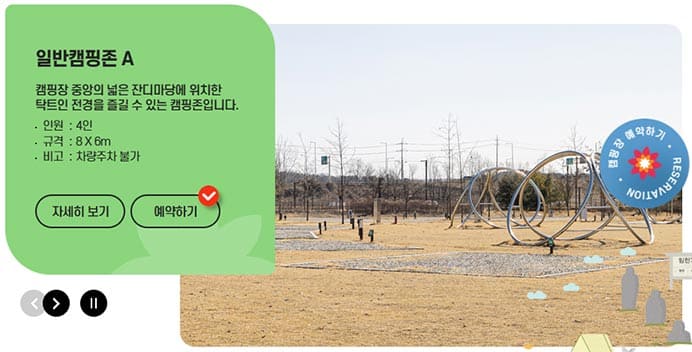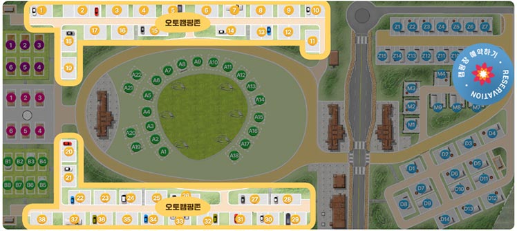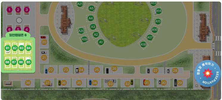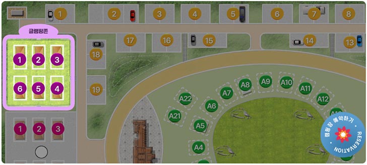 일반캠핑장과 오토캠핑존, 글램핑존, 카라반 존이 있습니다. 인원수와 차량진입 유무 등을 잘 알아보시고 예약하시길 바랍니다.