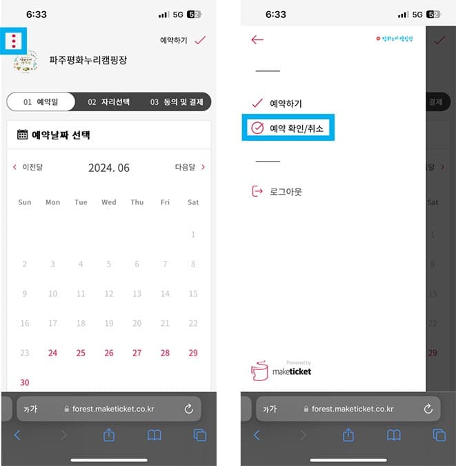 평화누리캠핑장 홈페이지 - [예약하기] - [예약확인/취소]에서 예약내역 확인 및 취소 가능합니다. 휴대폰으로 이용하시는 경우 예약하기 클릭 후 좌측 상단에 "붉은 점 3개 메뉴 아이콘" 클릭하시면 [예약 확인/취소] 메뉴 확인 가능합니다.