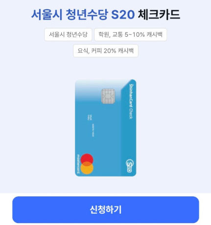 4. 계좌 개설 후 바로 "서울시 청년수당 S20 체크카드" 신청 버튼이 나타납니다.