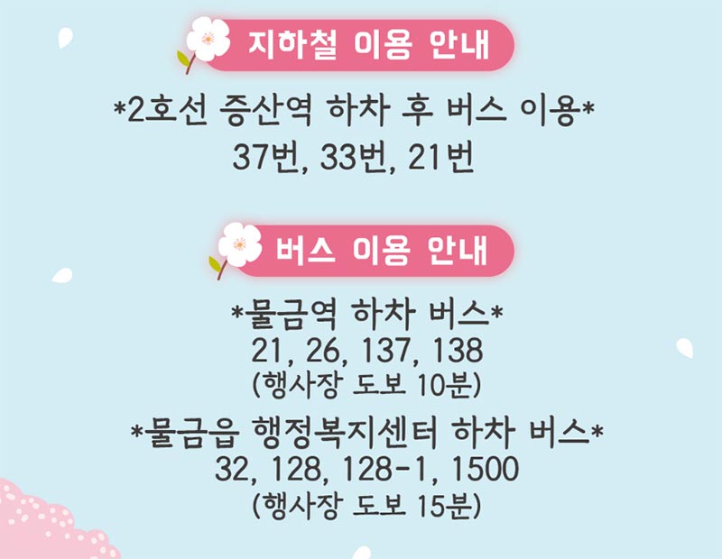 - 물급읍 행정복지센터 하차 버스 ( 행사장과 도보 15분 거리 ) : 32번, 128번, 128-1번, 1500번