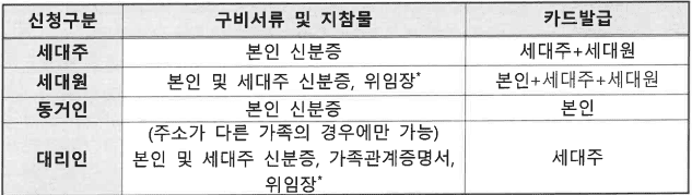 - 세대주(신분증 지참)가 세대원을 포함하여 일괄신청해야 합니다.