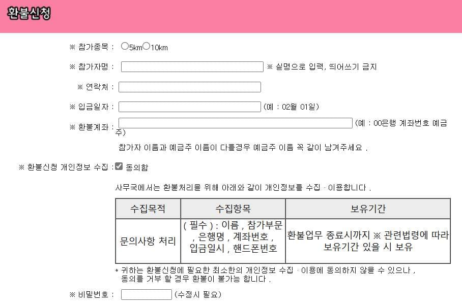 환불신청시 환불게시판에 성함, 전화번호, 참가코스, 환불받으실 은행명, 계좌번호를 꼭 적어주세요!