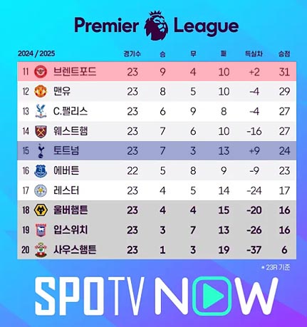 토트넘은 최근 극심한 부진에 빠져있습니다. 리그에서 최근 7경기 동안 1무 6패를 기록하며 승점을 쌓지 못했습니다. 이로 인해 토트넘은 현재 리그 15위까지 추락했으며, 강등권과의 격차가 1점에 불과한 위태로운 상황에 놓여있습니다.