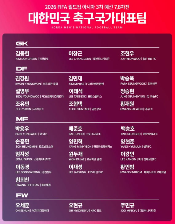 🔹 이번 소집에서 처음으로 이름을 올린 선수는 2명입니다. 골키퍼 김동헌, 수비수 조현택(이상 김천)이 홍명보 감독의 부름을 받았습니다.
