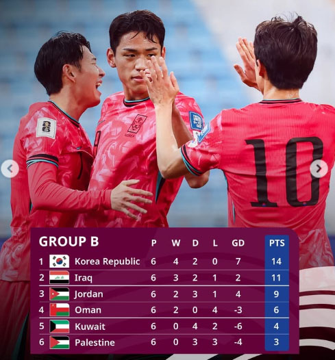 한국은 B조에서 현재 1위를 달리고 있습니다. 이번 오만전과 요르단전에서 전승시 하면 B조 1위가 확정되기 때문에 월드컵 본선행을 확정 지을 수 있습니다. 대한민국 연속 11회 월드컵 본선 진출이라는 대업을 이루게 됩니다.